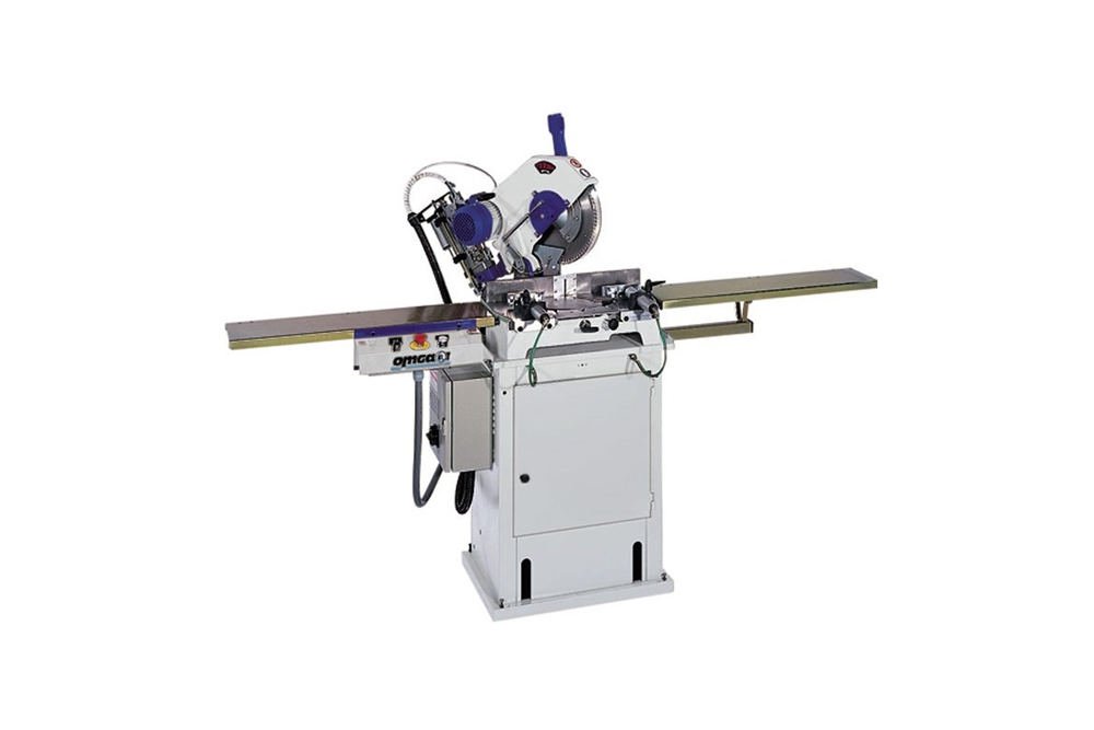 The heaviest duty of all model of OMGA's Precision Mitre Chop Saws (along with the T 53 370). It features a solid cast iron base and head construction. The rotating table rides on roller bearings for maximum smoothness and accuracy. Positive stops at 45, 30, 22 1/2, 15 and 10 degrees on both sides of the rotation and an independently fine tunable one at 90 degrees. A manual locking device for all the intermediate angles provides a great flexibility to this unit.